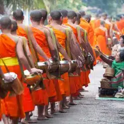 Avis aux lève-tôt ! : Alors que le soleil pointe à l’horizon (vers 6 heures), prenez place à un carrefour du centre-ville. Voilà un poste d’observation idéal pour voir défiler, comme chaque matin, les processions silencieuses de bonzes. Enveloppés dans leur robe safran, ils passent de maison en maison recueillir les offrandes des fidèles. Respectez-les, regardez-les en silence et abstenez-vous de perturber leur marche.