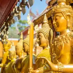 Continuez à pied le long de la rue Ta Pae avec ses anciennes maisons, petits restaurants, boutiques et temples séculaires bordant la rue, jusqu’à l’ancienne muraille de la ville et la porte Ta Pae qui donne accès à la vieille ville. Juste après vous arrivez au magnifique wat Phan Tao, ancienne salle du trône, tout en bois de teck et juste à côté, l’énorme Chedi Luang. Continuez avec votre chauffeur à travers la vieille ville, en passant par le Monument au Trois Rois, jusqu’au Wat Phra Singh et ses magnifiques peintures murales. Vous sortez de la vieille ville côté ouest et longez la douve en direction du sud, pour rejoindre le très étonnant Wat Sri Suphan « Temple d’Argent » : le hall d’ordination est recouvert d’un mélange d’aluminium et d’argent. Les artisans qui travaillent l’argent se trouvent dans les rues aux abords du temple.
