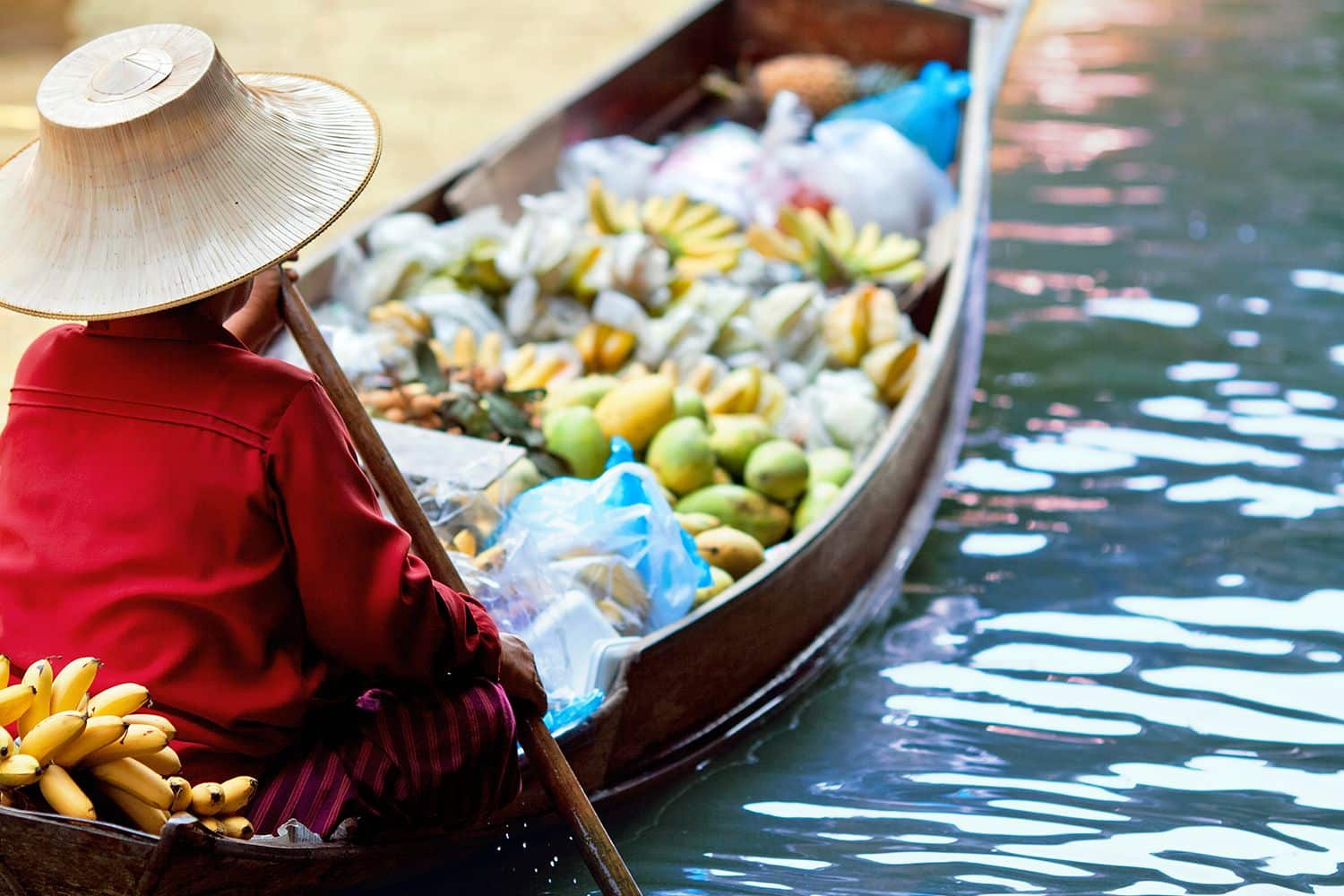 Le marché de Damnoen Saduak est situé dans la province de Ratchaburi à environ 1h de Bangkok. Sur la route, on profite du paysage entre les marais salants et les étales de sel dans une campagne luxuriante.Damnoen Saduak est le marché flottant le plus populaire et authentique de Thaïlande.Ce marché, haut en couleur et en animations, est quasiment fréquenté que par les touristes, les locaux ne viennent pas y faire leur course. Ce marché a été recréé pour montrer aux touristes une réalité de plus en plus rare en Thaïlande, celle des marchés flottants. Cela permet d’imaginer ce qu’était le Bangkok d’autrefois, à l’époque où la vie se passait sur des canaux plus que sur des chemins.Vous vous évaderez par ce défilé de bateaux de fruits exotiques, de légumes, de poissons, de crustacés au milieu de ces petites maisons en bois sur pilotis qui bordent les canneaux où les habitants vivent au bord du fleuve.Laissez-vous guider par les marchandes au tenue traditionnelle : tunique bleue et chapeau de paille circulaire et continuez avec le marché non flottant, installé sur les quais.Les locaux parviennent à nous faire passer un moment inoubliable grâce à leur accueil et leur sourire.